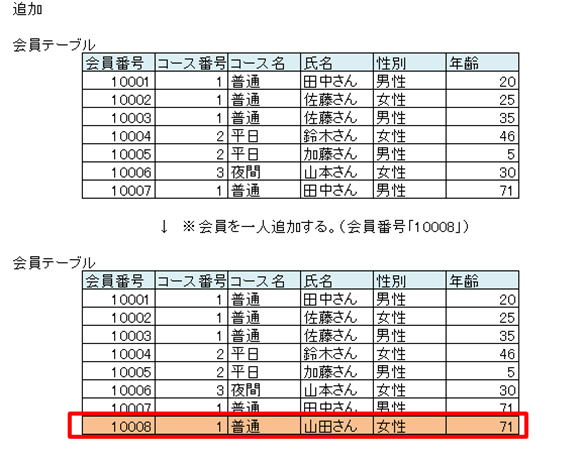 insert into 会員テーブル(会員番号,コース番号,コース名,氏名,性別,年齢)