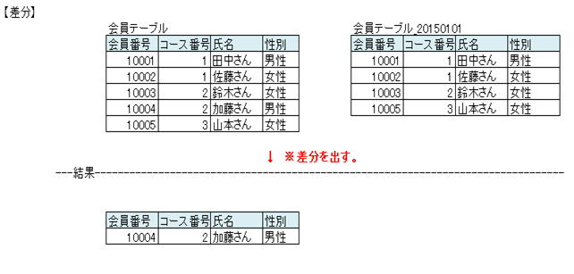 【SQL】 select * from 会員テーブル minus select * from 会員テーブル_20150101 ※1.上記テーブルからみて差分があるかという確認になる為、 上下を逆転させると、今回の例では差分無しとなるので注意が必要。